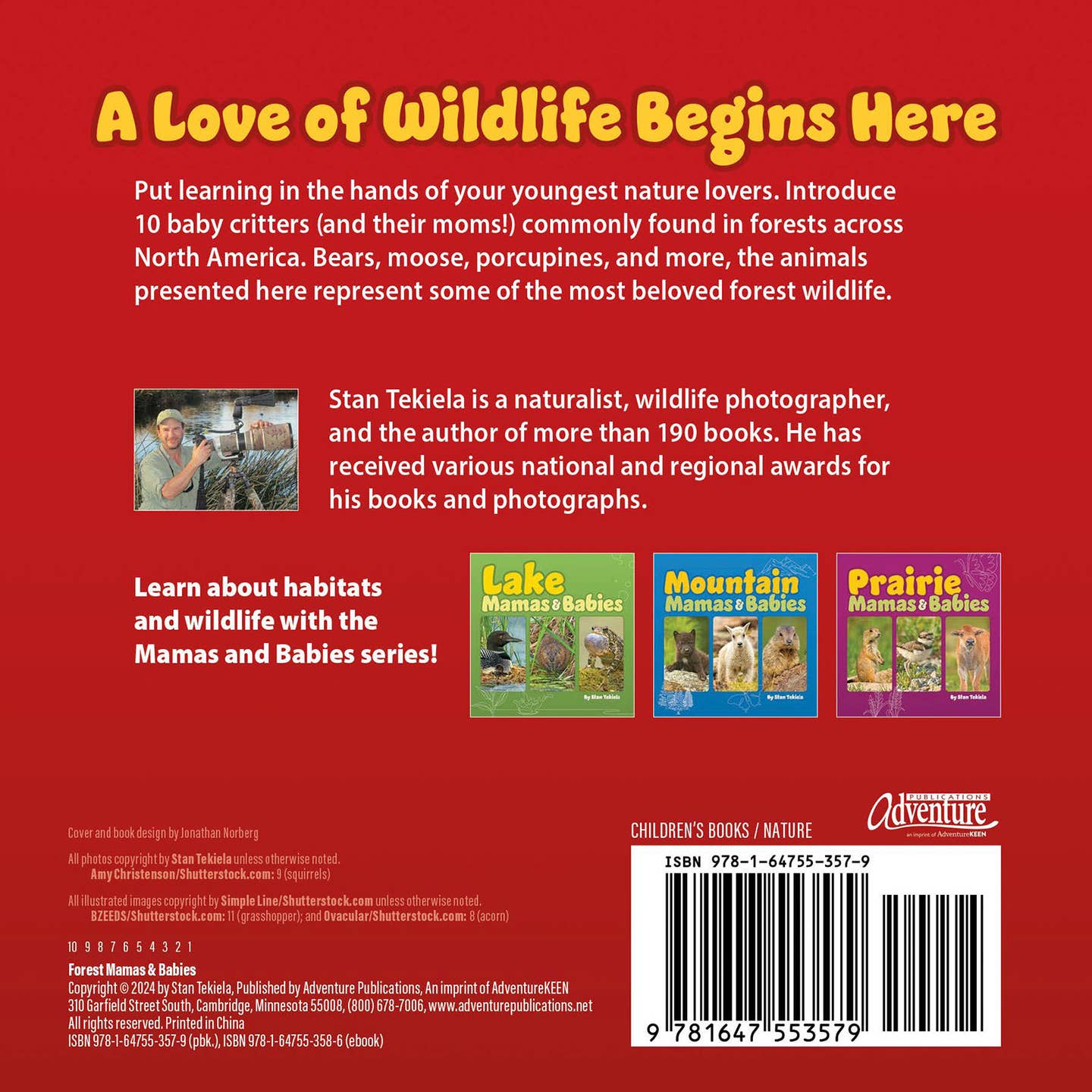 Board books put images and words in the hands of young children who are eager to learn. Feed their curiosity and jump-start their education with the Mamas and Babies series of board books. Let Forest Mamas & Babies capture the interest of your family’s youngest nature lovers, ages 0–5. The board book introduces 10 baby critters (and their moms!) commonly found in forests across North America. Written by award-winning author, naturalist, and wildlife photographer Stan Tekiela, the children’s book utilizes full-color photography and short, simple text to present a few facts about each animal.