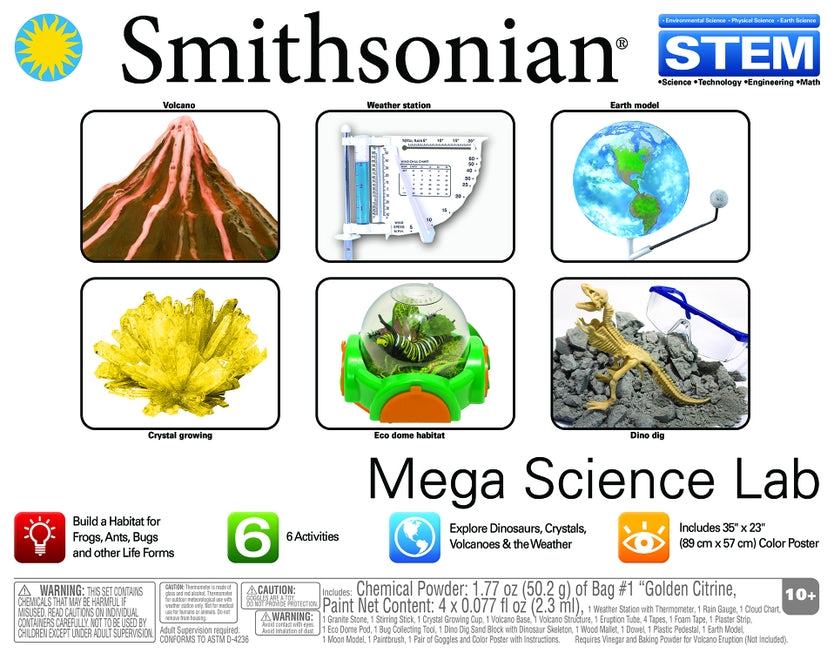 Mega Science Lab has six STEM kits in one! Observe the process of crystal formation, assemble and paint a model of the earth and moon, and erupt your very own volcano. Create an Eco Dome Habitat where you can catch, collect, and study bugs. Assemble and install your weather station and start logging temperature, wind direction and speed, barometric pressure, humidity, clouds, and precipitation. Put on your safety goggles and chisel away at your sand block as you excavate bones that you can assemble into a model dinosaur.